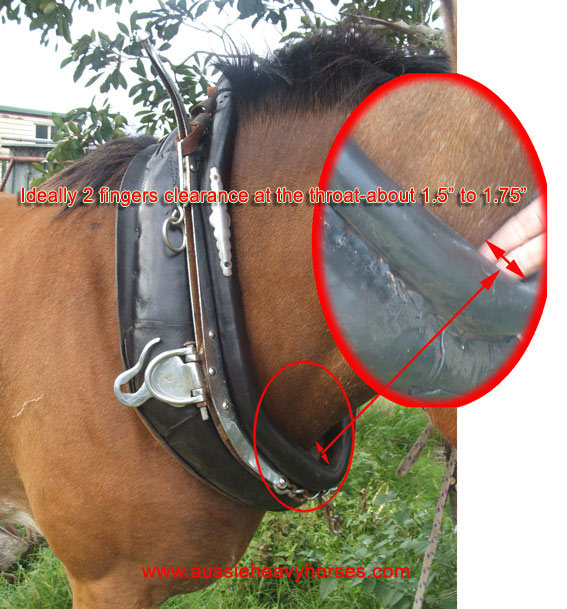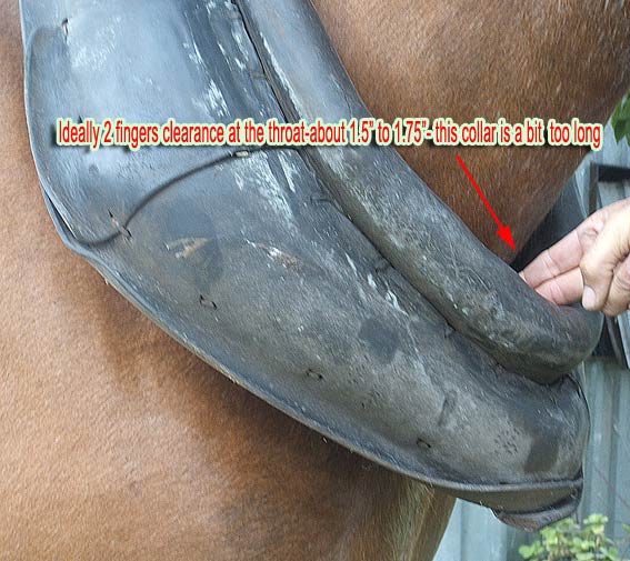 This shows the idea gap-two fingers vertically- between the rim of the collar and the horse's windpipe, when in action.